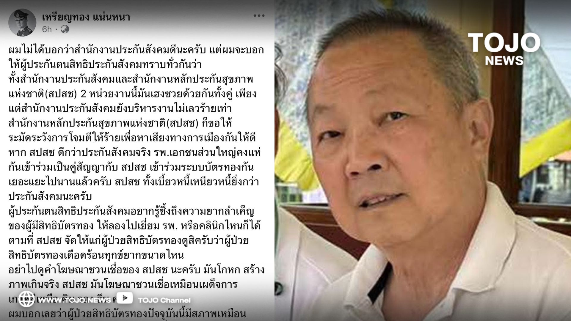 หมอเหรียญทอง ชี้ จะสปสช. หรือประกันสังคม เฮงซวยพอกัน แต่ต้องระวังการโจมตีหวังผลทางการเมือง