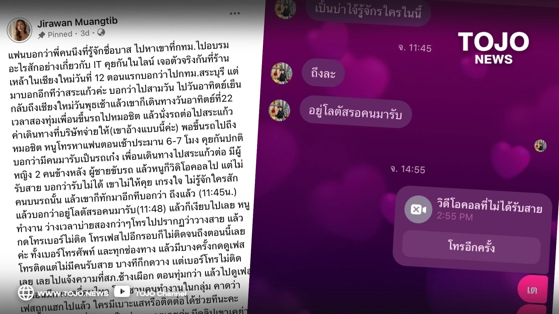 ผู้สื่อข่าวโตโจ้นิวส์รายงานว่า ผู้ใช้เฟซบุ๊ก ชื่อ Jirawan Muangtib โพสต์ข้อความระบุว่า