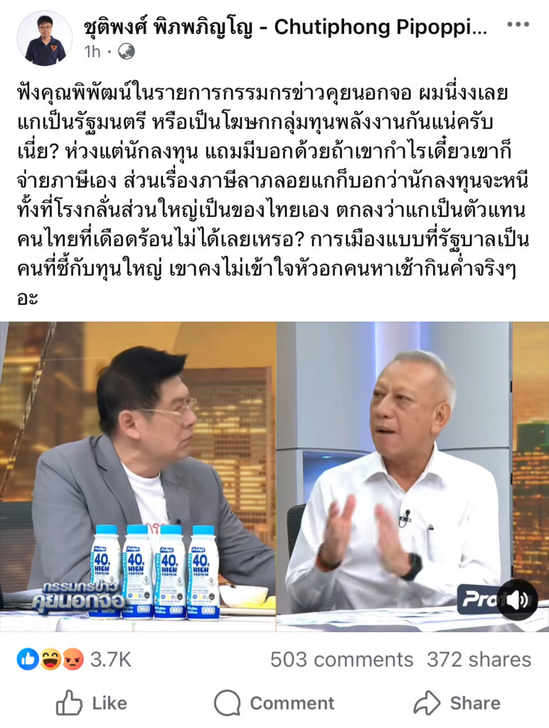 ชุติพงศ์ ชี้ คำตอบพิพัฒน์ในรายการกรรมกรข่าวคุยนอกจอ ห่วงแต่นักลงทุน ไม่ใช่ตัวแทนคนไทยที่เดือดร้อน