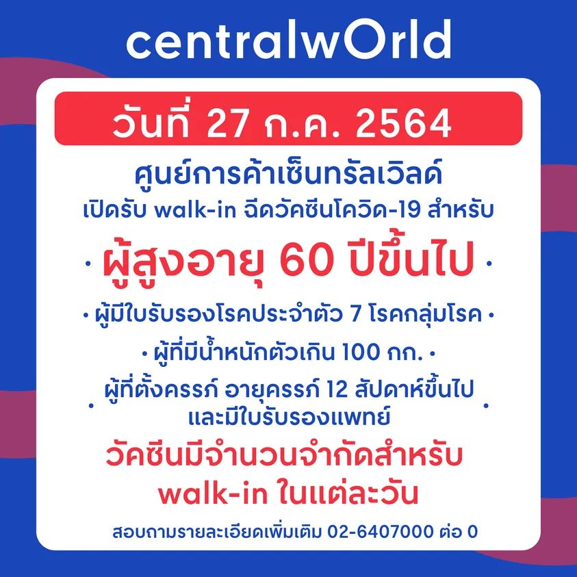เซ็นทรัลเวิลด์ เปิดรับ Walk-in ฉีดวัคซีนโควิด-19 วันนี้ 27 ก.ค.
