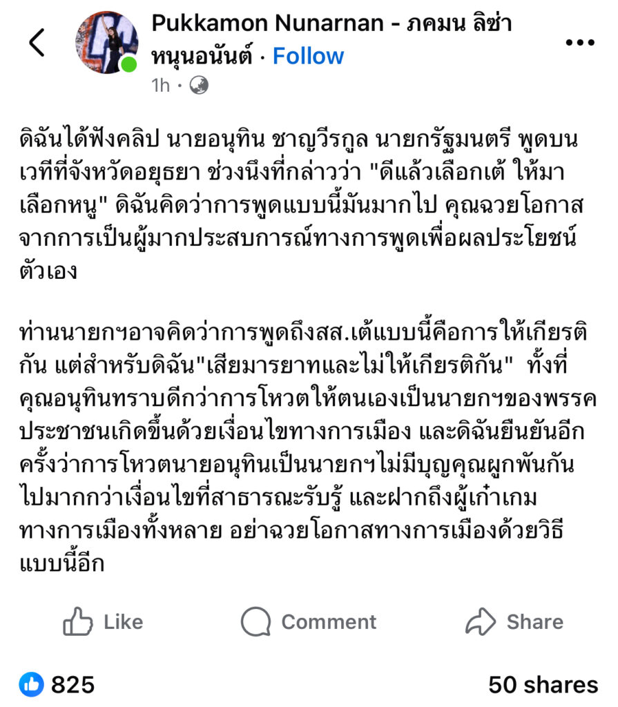 ท่านนายกฯอาจคิดว่าการพูดถึงสส.เต้แบบนี้คือการให้เกียรติกัน แต่สำหรับดิฉัน”เสียมารยาทและไม่ให้เกียรติกัน” ทั้งที่คุณอนุทินทราบดีกว่าการโหวตให้ตนเองเป็นนายกฯของพรรคประชาชนเกิดขึ้นด้วยเงื่อนไขทางการเมือง และดิฉันยืนยันอีกครั้งว่าการโหวตนายอนุทินเป็นนายกฯไม่มีบุญคุณผูกพันกันไปมากกว่าเงื่อนไขที่สาธารณะรับรู้ และฝากถึงผู้เก๋าเกมทางการเมืองทั้งหลาย อย่าฉวยโอกาสทางการเมืองด้วยวิธีแบบนี้อีก
