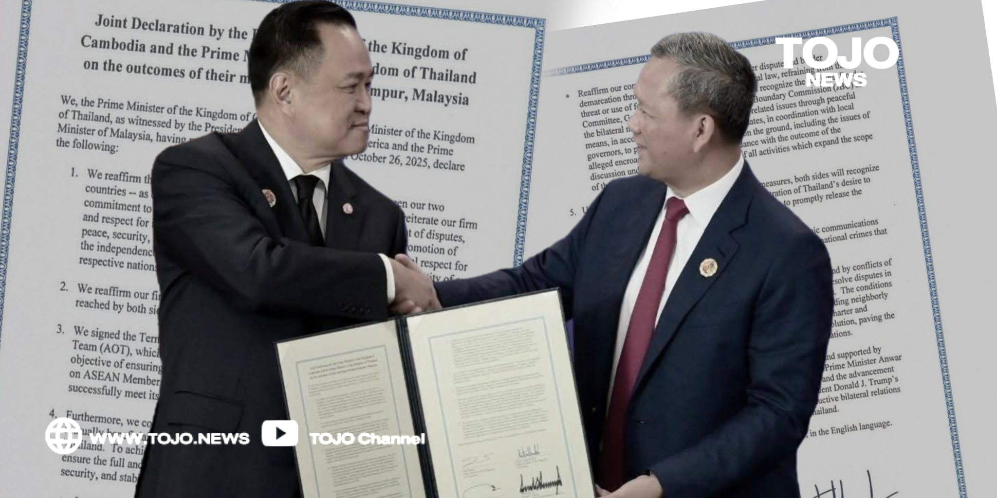 ผู้สื่อข่าวโตโจ้นิวส์รายงานว่า เมื่อวันที่ 26 ตุลาคม 2568 นายสิริพงศ์ อังคสกุลเกียรติ โฆษกประจำสำนักนายกรัฐมนตรี เปิดเผยว่า การลงนาม Joint Declaration by the Prime Minister of the Kingdom of Cambodia and the Prime Minister of the Kingdom of Thailand on the outcomes of their meeting in Kuala Lumpur, Malaysia ณ กรุงกัวลาลัมเปอร์ ประเทศมาเลเซีย มีสาระสำคัญ ดังนี้