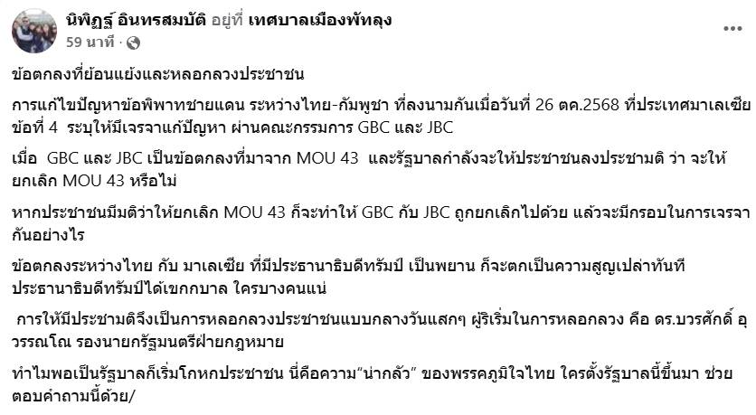 เมื่อ GBC และ JBC เป็นข้อตกลงที่มาจาก MOU 43 และรัฐบาลกำลังจะให้ประชาชนลงประชามติ ว่า จะให้ยกเลิก MOU 43 หรือไม่