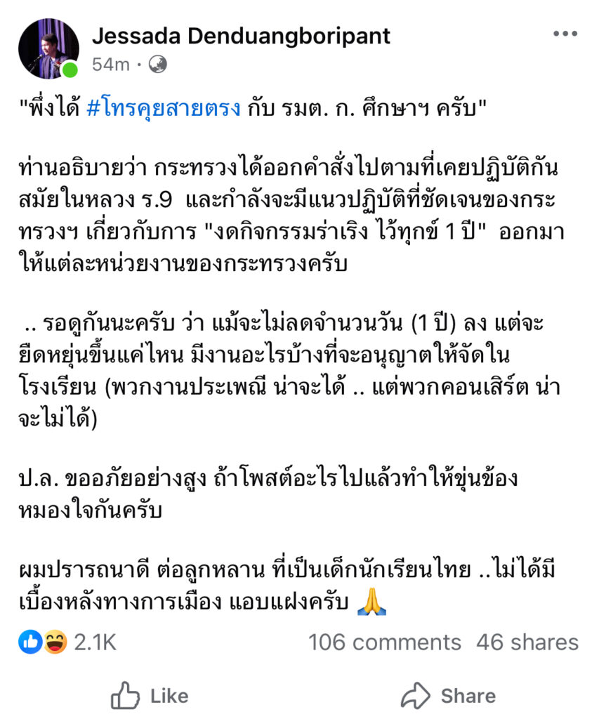 อ.เจษฎา เผยคำชี้แจงจากนฤมล หลังมีประกาศงดกิจกรรมรื่นเริงในโรงเรียน 1 ปี ปฏิบัติตาม