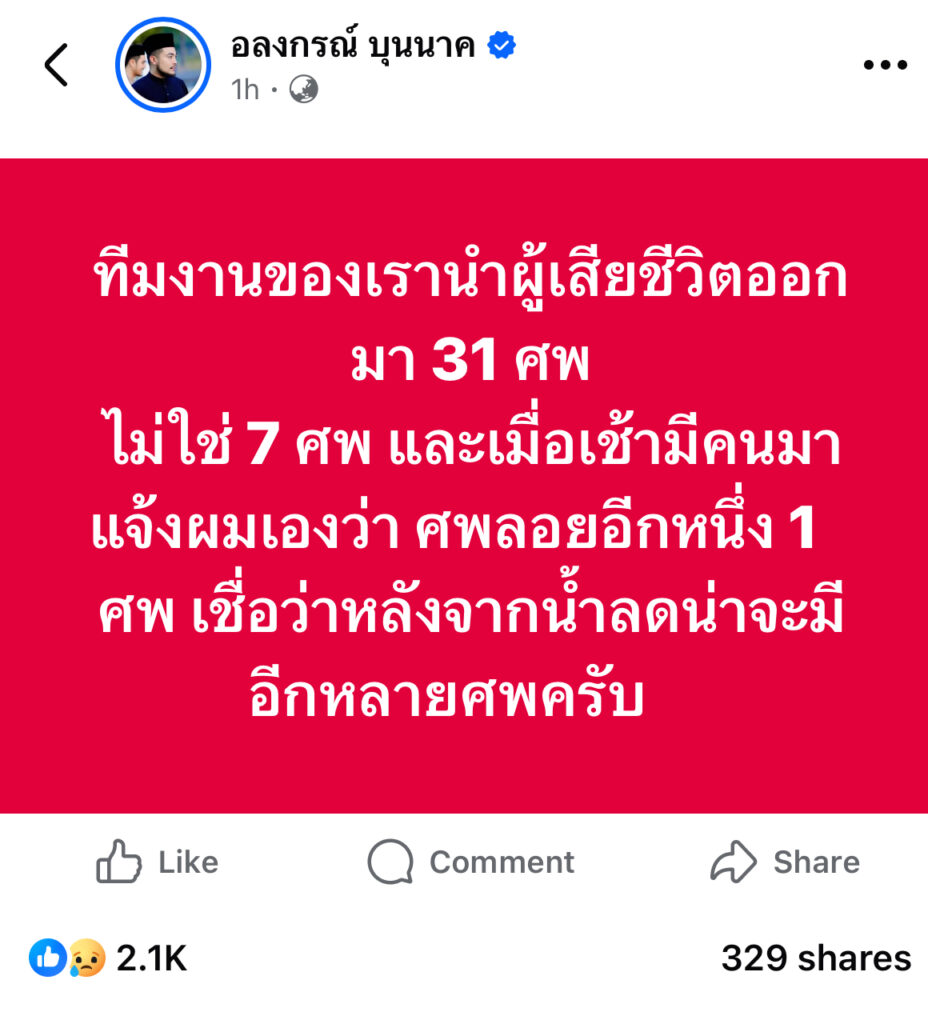 ไม่ใช่ 7 ศพ และเมื่อเช้ามีคนมาแจ้งผมเองว่า ศพลอยอีกหนึ่ง 1ศพ เชื่อว่าหลังจากน้ำลดน่าจะมีอีกหลายศพครับ