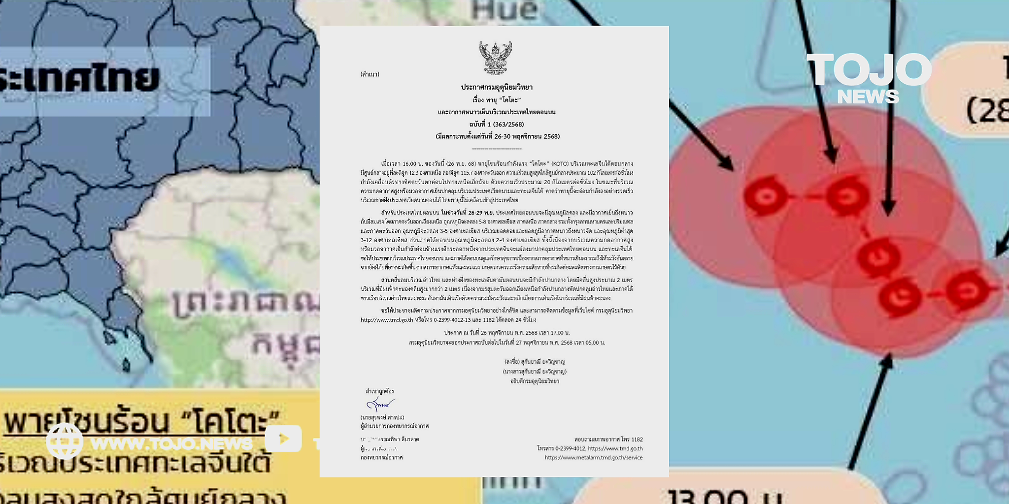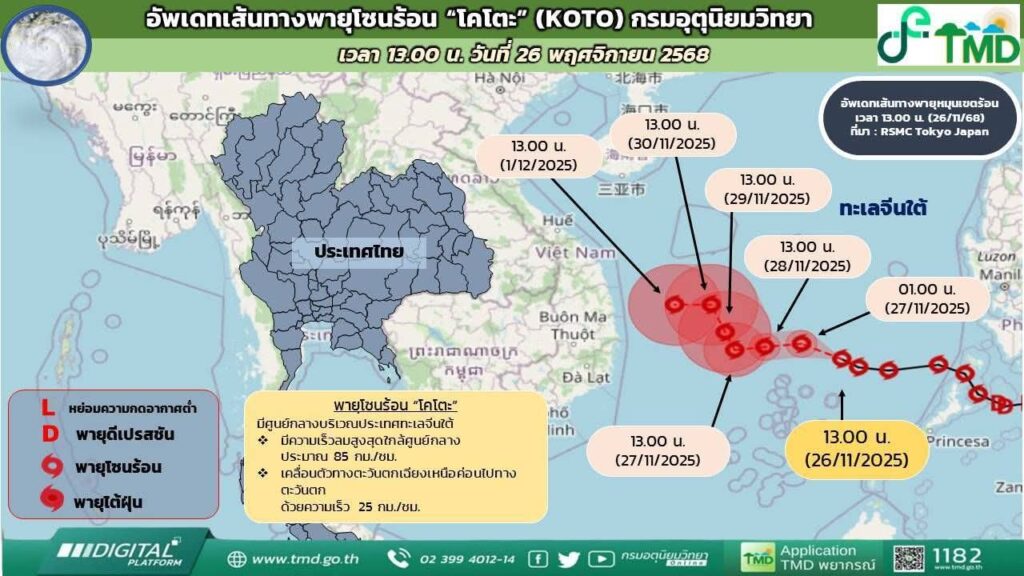 ผู้สื่อข่าวโตโจ้นิวส์รายงานว่า อุตุนิยมวิทยา ออกประกาศกรมอุตุนิยมวิทยา ฉบับที่ 1 เรื่อง พายุ “โคโตะ” และอากาศหนาวเย็นบริเวณประเทศไทยตอนบน มีผลกระทบตั้งแต่วันที่ 26-30 พฤศจิกายน 2568