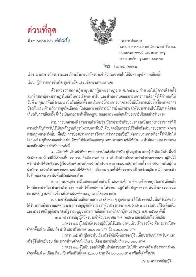 อธิบดีกรมการปกครองสั่งด่วน! ห้ามเจ้าหน้าที่รัฐ กำนัน ผู้ใหญ่บ้าน และผู้นำท้องถิ่น เก็บหรือครอบครองบัตรประชาชนเพื่อแสวงประโยชน์การเลือกตั้ง ฝ่าฝืนดำเนินคดีโดยเด็ดขาด
