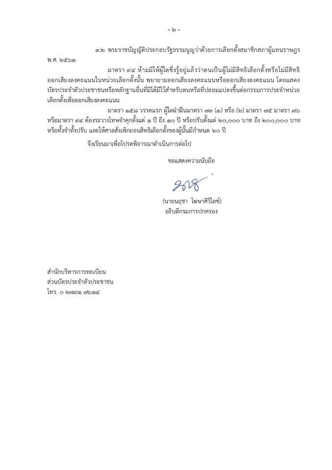 อธิบดีกรมการปกครองย้ำว่า จะดำเนินการตามกฎหมายอย่างเด็ดขาดกับผู้ฝ่าฝืน เพื่อรักษาความศักดิ์สิทธิ์ของสิทธิเลือกตั้งและความเชื่อมั่นของประชาชนต่อระบอบประชาธิปไตย สร้างความเชื่อมั่นต่อกระบวนการเลือกตั้งให้เป็นไปโดยสุจริต ยุติธรรมและโปร่งใส