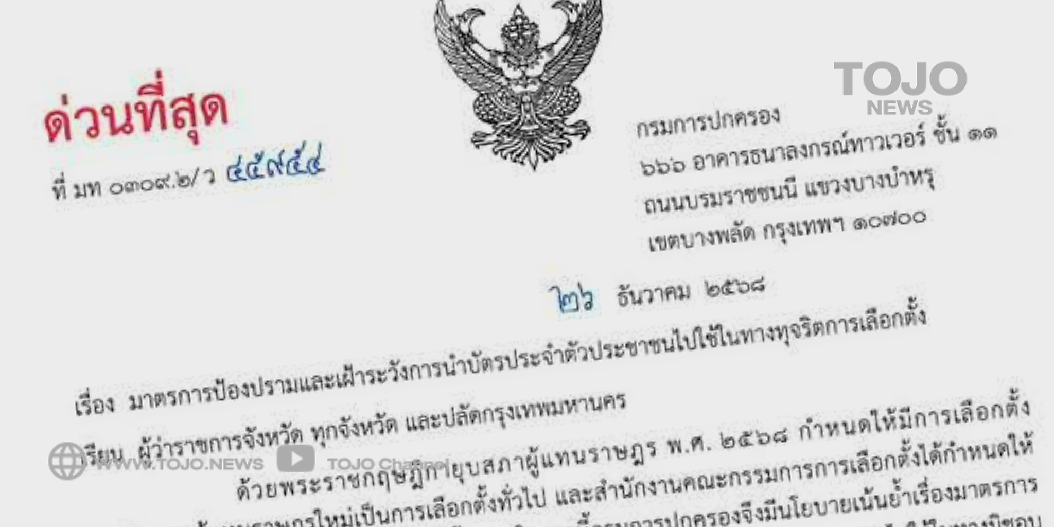 ผู้สื่อข่าวโตโจ้นิวส์รายงานว่า เมื่อวันที่ 26 ธันวาคม 2568 นายนฤชา โฆษาศิวิไลซ์ อธิบดีกรมการปกครอง ได้มีหนังสือ ด่วนที่สุด เรื่อง มาตรการป้องปรามและเฝ้าระวังการนำบัตรประจำตัวประชาชนไปใช้ในทางทุจริตการเลือกตั้ง ถึงผู้ว่าราชการจังหวัดทุกจังหวัด และปลัดกรุงเทพมหานคร เพื่อเน้นย้ำการป้องกันและปราบปรามการทุจริตเลือกตั้งอย่างเคร่งครัด