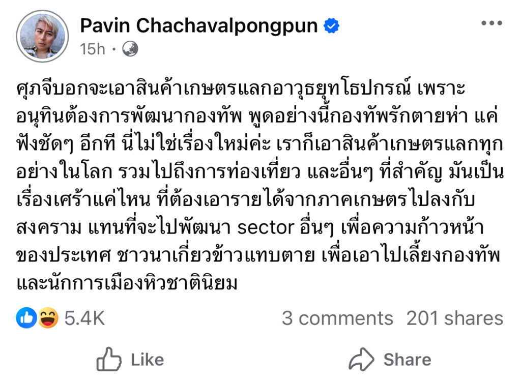 ปวิน ลั่น! ชาวนาเกี่ยวข้าวแทบตาย เอาไปเลี้ยงกองทัพและนักการเมืองหิวชาตินิยม?