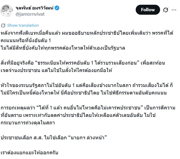 หัวใจของระบบรัฐสภาไม่ใช่อันดับ 1 แต่คือเสียงข้างมากในสภา ถ้ารวมเสียงไม่ได้ ก็ไม่มีใครเป็นหนี้ต้องโหวตให้ นี่คือประชาธิปไตย ไม่ใช่พิธีกรรมตามอันดับคะแนน