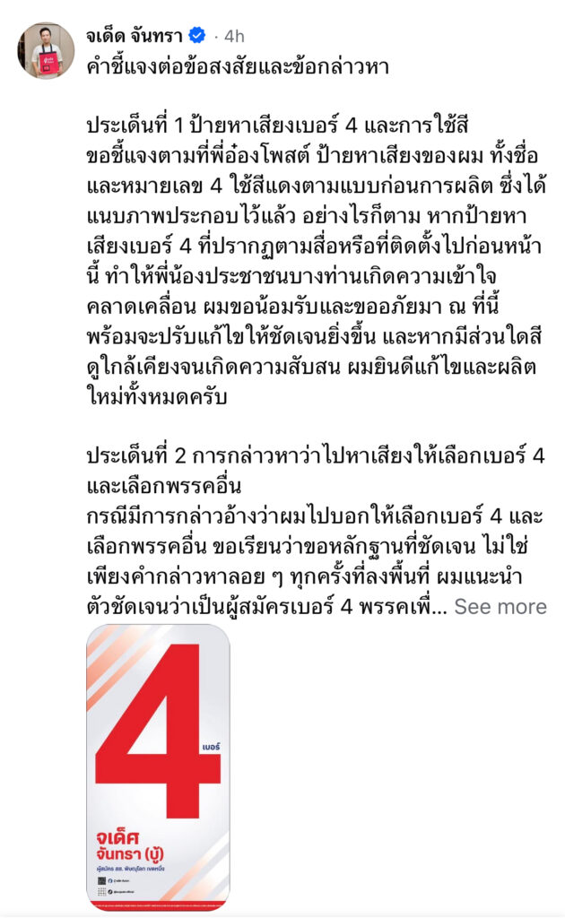 ขอชี้แจงตามที่พี่อ๋องโพสต์ ป้ายหาเสียงของผม ทั้งชื่อและหมายเลข 4 ใช้สีแดงตามแบบก่อนการผลิต ซึ่งได้แนบภาพประกอบไว้แล้ว อย่างไรก็ตาม หากป้ายหาเสียงเบอร์ 4 ที่ปรากฏตามสื่อหรือที่ติดตั้งไปก่อนหน้านี้ ทำให้พี่น้องประชาชนบางท่านเกิดความเข้าใจคลาดเคลื่อน ผมขอน้อมรับและขออภัยมา ณ ที่นี้ พร้อมจะปรับแก้ไขให้ชัดเจนยิ่งขึ้น และหากมีส่วนใดสีดูใกล้เคียงจนเกิดความสับสน ผมยินดีแก้ไขและผลิตใหม่ทั้งหมดครับ