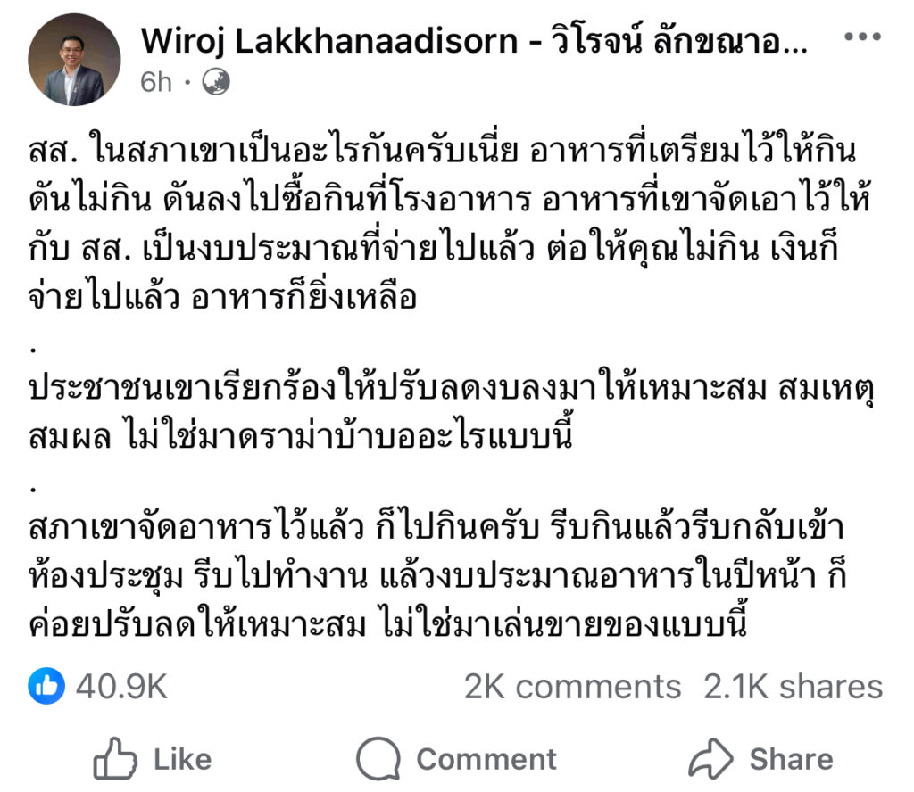 สภาเขาจัดอาหารไว้แล้ว ก็ไปกินครับ รีบกินแล้วรีบกลับเข้าห้องประชุม รีบไปทำงาน แล้วงบประมาณอาหารในปีหน้า ก็ค่อยปรับลดให้เหมาะสม ไม่ใช่มาเล่นขายของแบบนี้