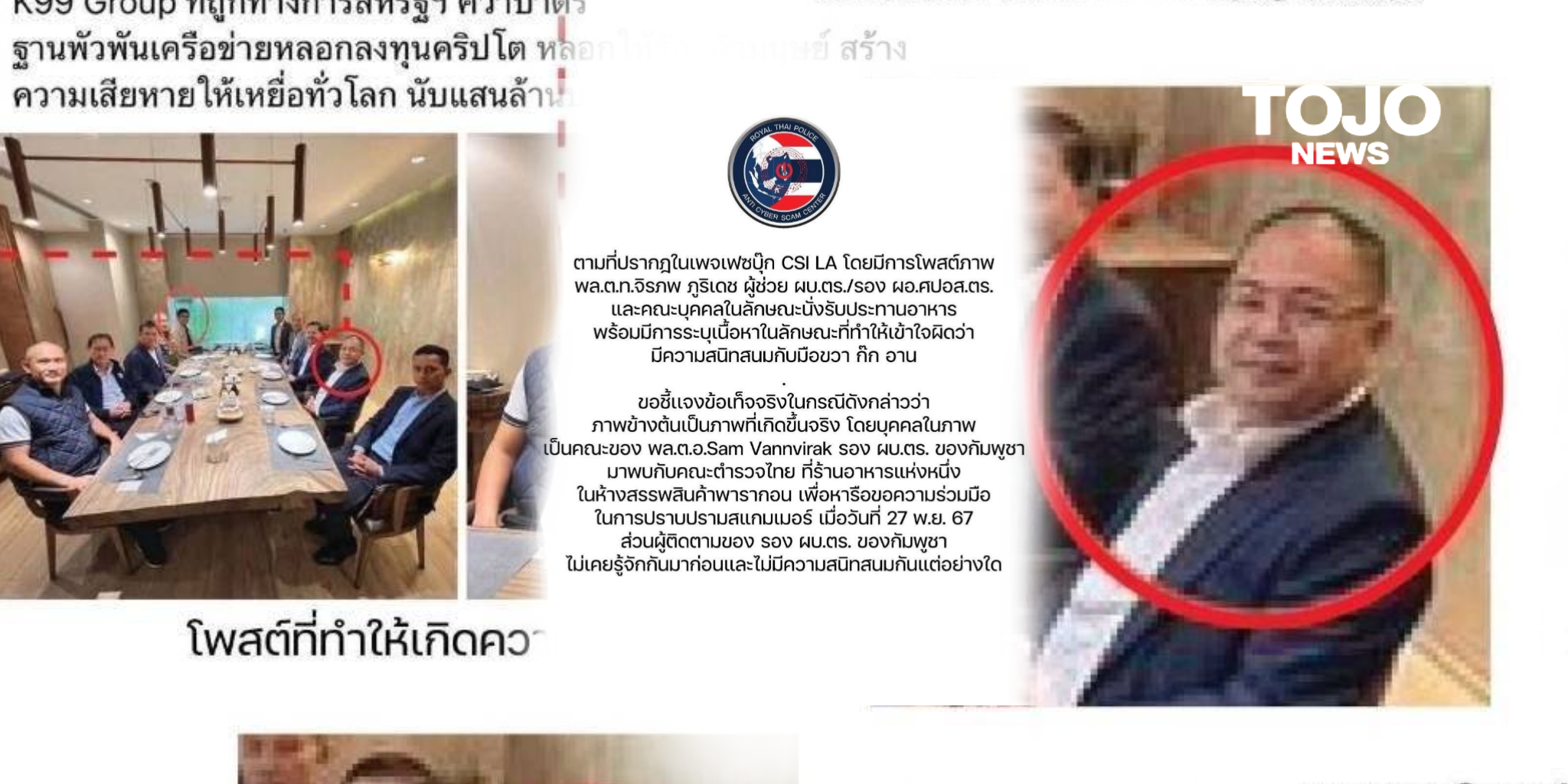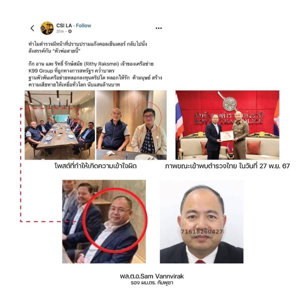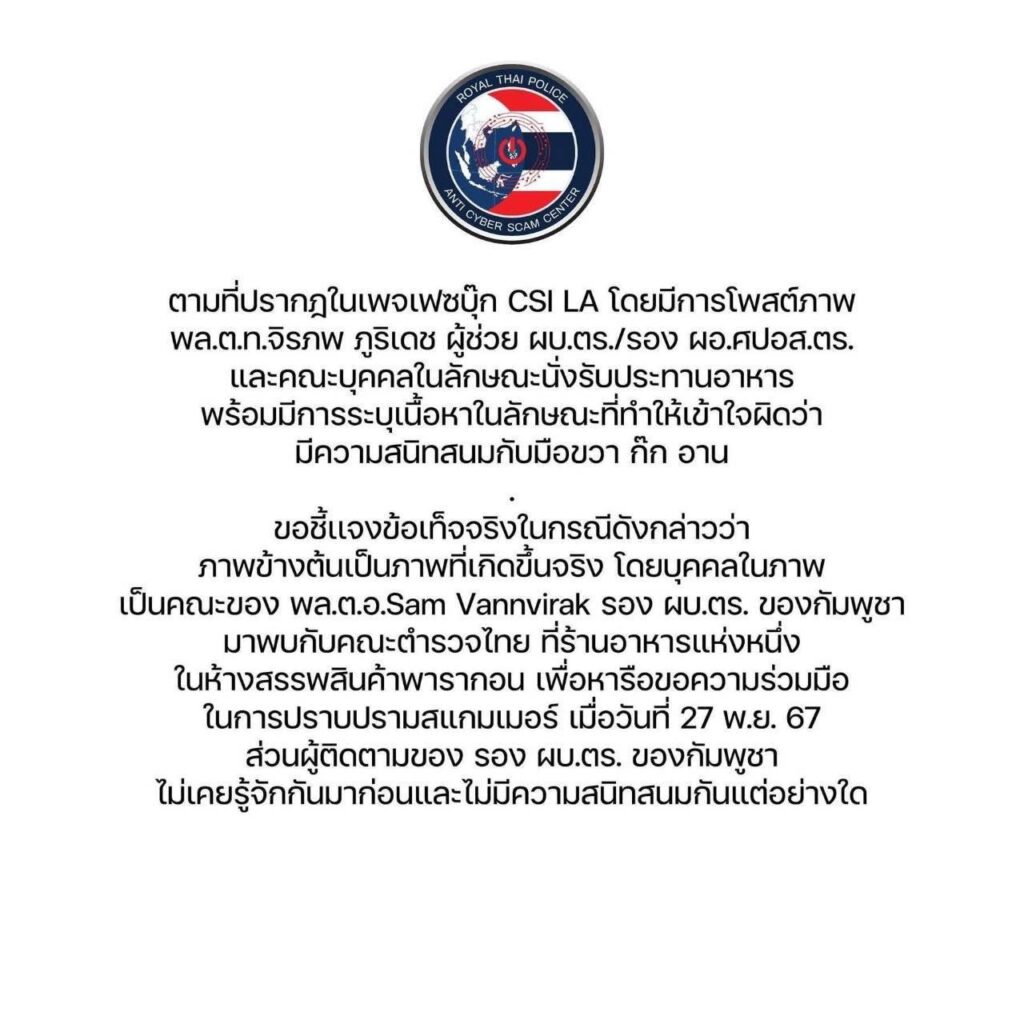 ข้อเท็จจริงของเหตุการณ์: ภาพดังกล่าวเป็นการพบปะระหว่างคณะตำรวจไทย และคณะของ พล.ต.อ. Sam Vannvirak รอง ผบ.ตร. ของประเทศกัมพูชา ณ ร้านอาหารแห่งหนึ่งในห้างสรรพสินค้าสยามพารากอน เมื่อวันที่ 27 พ.ย. 67
