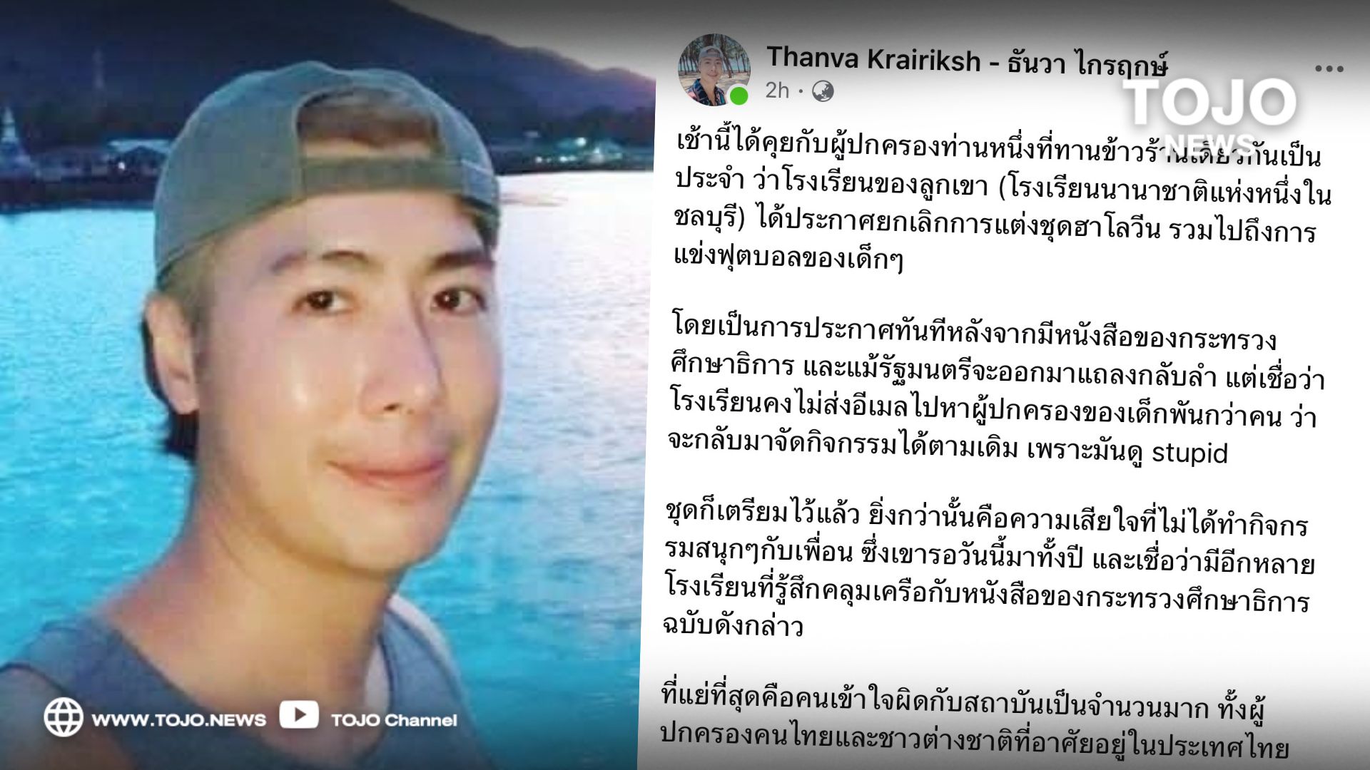 เช้านี้ได้คุยกับผู้ปกครองท่านหนึ่งที่ทานข้าวร้านเดียวกันเป็นประจำ ว่าโรงเรียนของลูกเขา (โรงเรียนนานาชาติแห่งหนึ่งในชลบุรี) ได้ประกาศยกเลิกการแต่งชุดฮาโลวีน รวมไปถึงการแข่งฟุตบอลของเด็กๆ