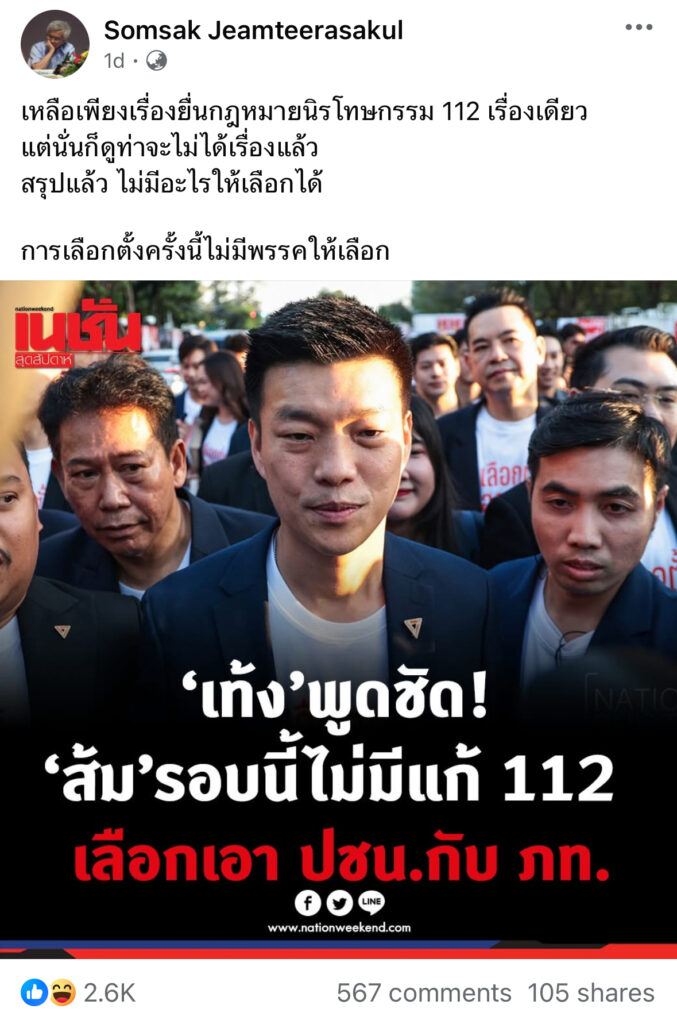 สมศักดิ์เจียม ผิดหวัง หัวหน้าเท้งยืนยันไม่มีนโยบายแก้ ม.112 ลั่น เลือกตั้งครั้งนี้ไม่มีพรรคให้เลือก