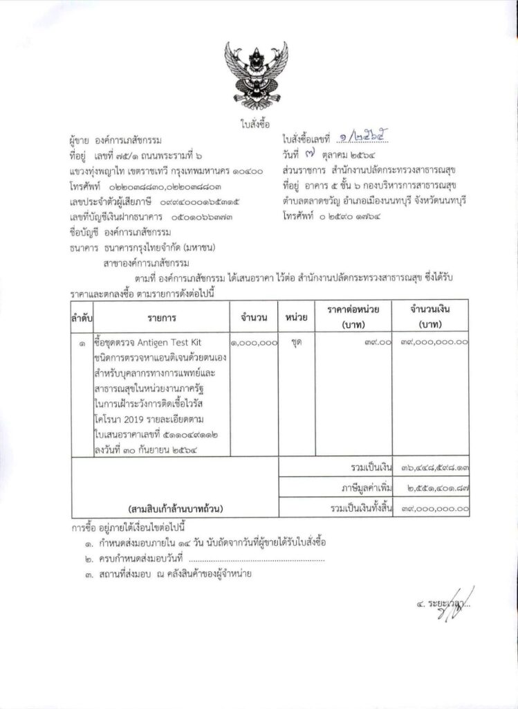 เอกสารใบสั่งซื้อ ATK ของกระทรวงสาธารณสุข
