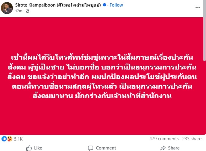 ศิโรตม์ โดนโทรศัพท์ข่มขู่ เรื่องประกันสังคม เผย รู้ว่าใคร เป็นอนุกรรมการประสังคม