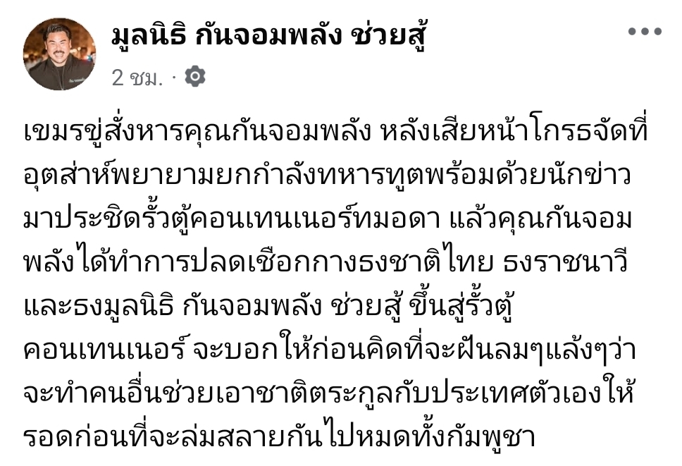 เขมรขู่สั่งหารคุณกันจอมพลัง หลังเสียหน้าโกรธจัดที่อุตส่าห์พยายามยกกำลังทหารทูตพร้อมด้วยนักข่าวมาประชิดรั้วตู้คอนเทนเนอร์ทมอดา แล้วคุณกันจอมพลังได้ทำการปลดเชือกกางธงชาติไทย ธงราชนาวี และธงมูลนิธิ กันจอมพลัง ช่วยสู้ ขึ้นสู่รั้วตู้คอนเทนเนอร์ จะบอกให้ก่อนคิดที่จะฝันลมๆแล้งๆว่าจะทำคนอื่นช่วยเอาชาติตระกูลกับประเทศตัวเองให้รอดก่อนที่จะล่มสลายกันไปหมดทั้งกัมพูชา
