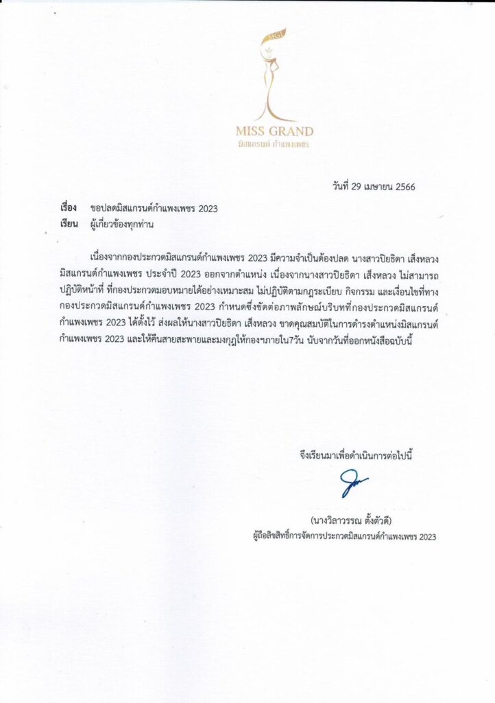 โดยระบุว่า “เนื่องจากกองประกวดมิสแกรนด์กำแพงเพชร 2023 มีความจำเป็นต้องปลด นางสาวปิยธิดา เส็งหลวง มิสแกรนด์กำแพงเพชร ประจำปี 2023 ออกจากตำแหน่ง