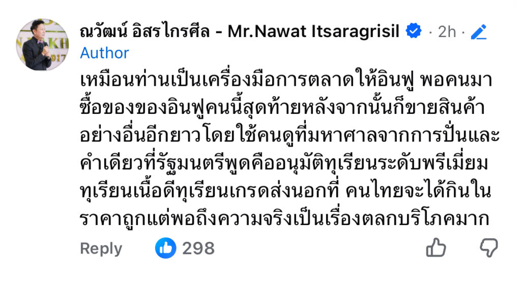 เหมือนท่านเป็นเครื่องมือการตลาดให้อินฟู พอคนมาซื้อของของอินฟูคนนี้สุดท้ายหลังจากนั้นก็ขายสินค้าอย่างอื่นอีกยาวโดยใช้คนดูที่มหาศาลจากการปั่นและคำเดียวที่รัฐมนตรีพูดคืออนุมัติทุเรียนระดับพรีเมี่ยมทุเรียนเนื้อดีทุเรียนเกรดส่งนอกที่ คนไทยจะได้กินในราคาถูกแต่พอถึงความจริงเป็นเรื่องตลกบริโภคมาก