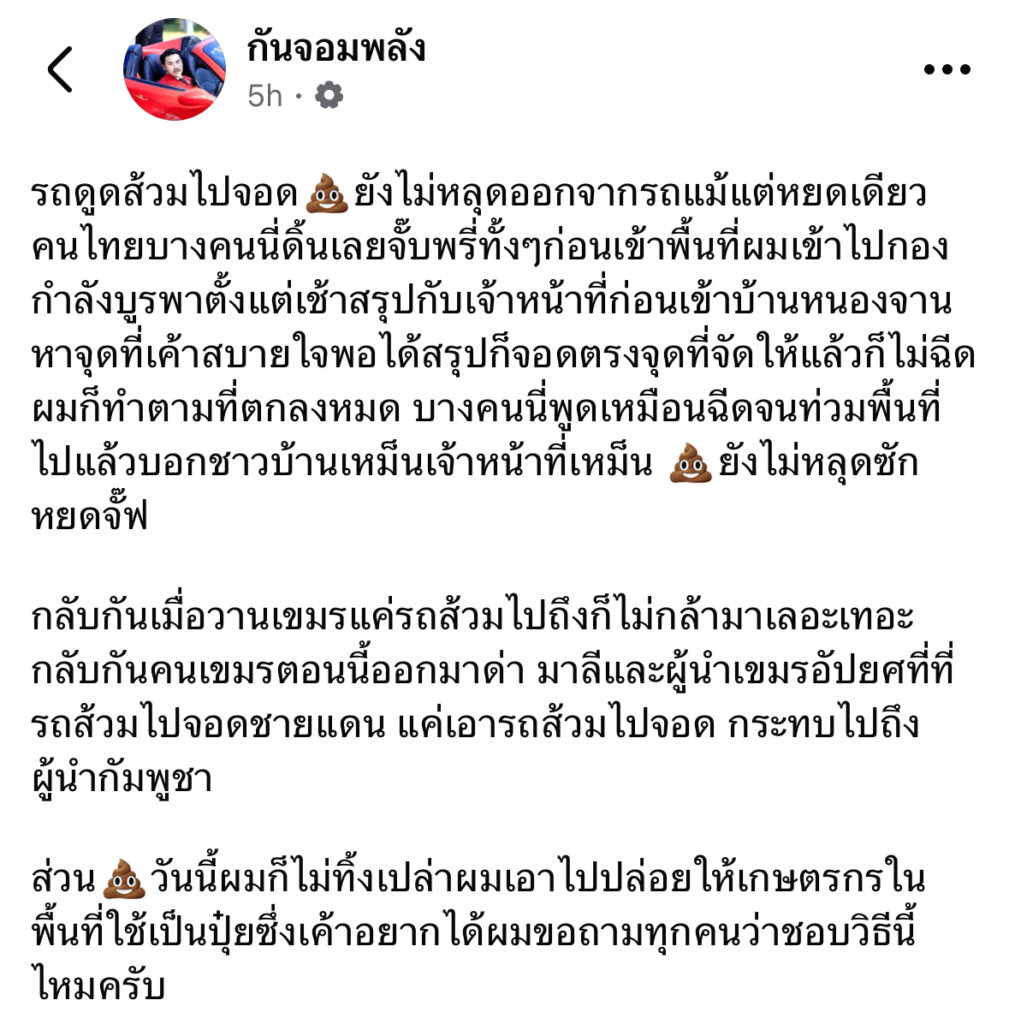 กลับกันเมื่อวานเขมรแค่รถส้วมไปถึงก็ไม่กล้ามาเลอะเทอะกลับกันคนเขมรตอนนี้ออกมาด่า มาลีและผู้นำเขมรอัปยศที่ที่รถส้วมไปจอดชายแดน แค่เอารถส้วมไปจอด กระทบไปถึงผู้นำกัมพูชา