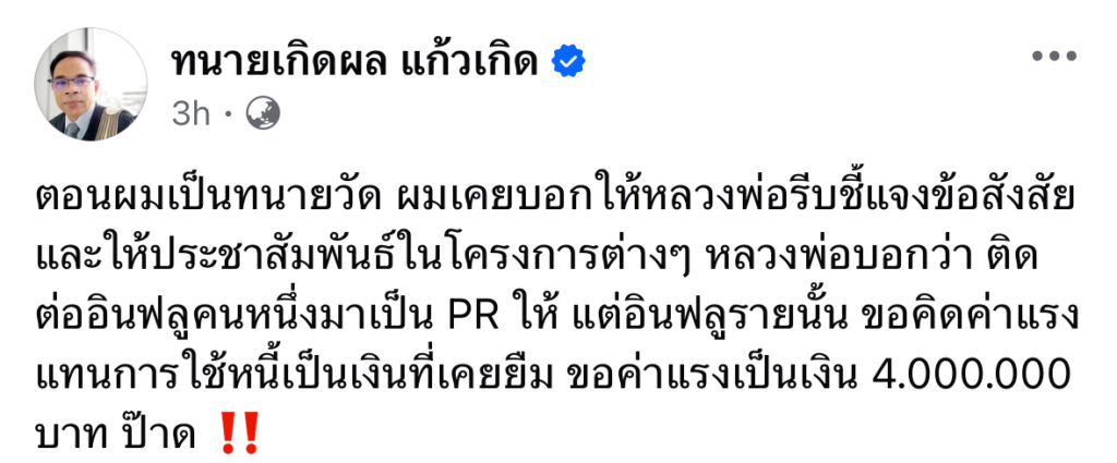 ตอนผมเป็นทนายวัด ผมเคยบอกให้หลวงพ่อรีบชี้แจงข้อสังสัย และให้ประชาสัมพันธ์ในโครงการต่างๆ หลวงพ่อบอกว่า ติดต่ออินฟลูคนหนึ่งมาเป็น PR ให้ แต่อินฟลูรายนั้น ขอคิดค่าแรงแทนการใช้หนี้เป็นเงินที่เคยยืม ขอค่าแรงเป็นเงิน 4.000.000 บาท ป๊าด