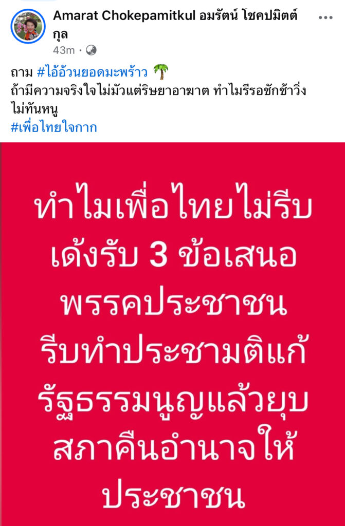 อมรัตน์ ถามหาอ้วนยอดมะพร้าว รับข้อเสนอพรรคประชาชน ลั่น ถ้าจริงใจก็รีบมา