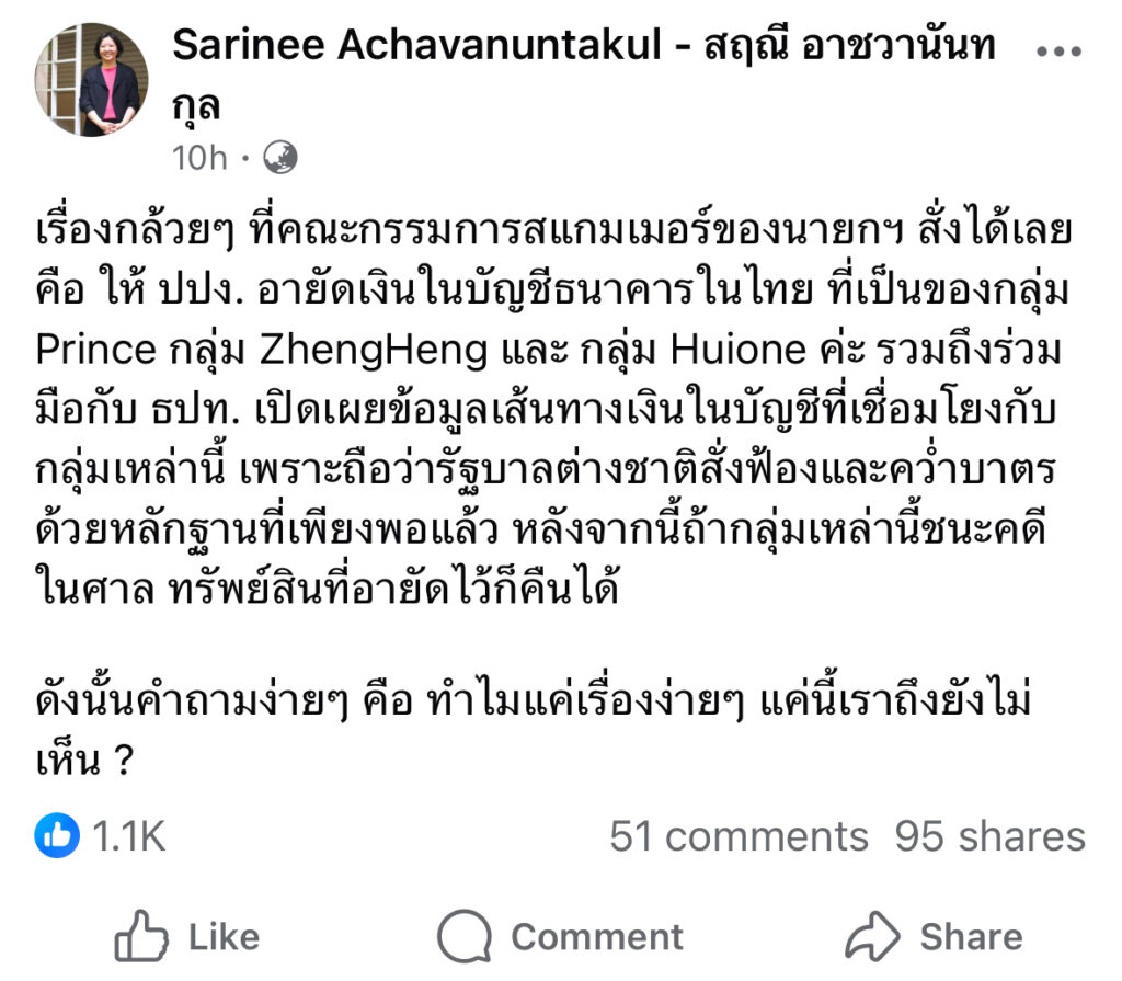 สฤณี จี้! คณะกรรมการสแกมเมอร์ของนายกฯ เริ่มอายัดเงินบัญชีธนาคารของกลุ่มที่โดนต่างชาติคว่ำบาตรและสั่งฟ้องได้เลย