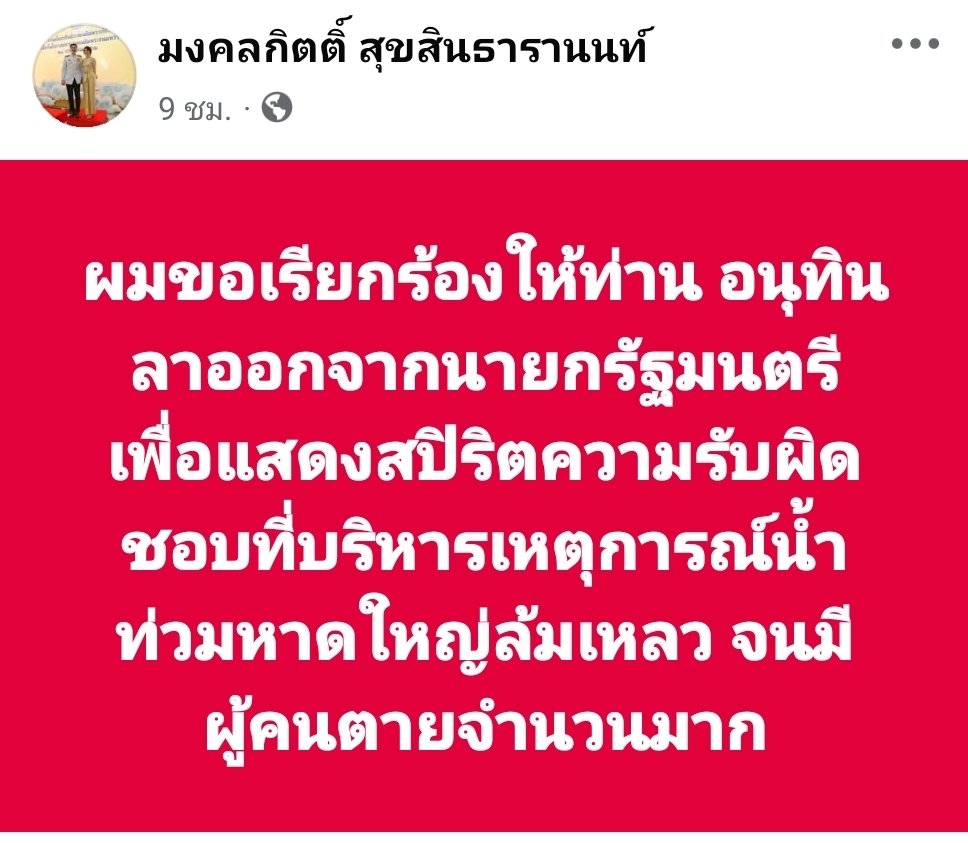 ผมขอเรียกร้องให้ท่าน อนุทิน ลาออกจากนายกรัฐมนตรี เพื่อแสดงสปิริตความรับผิดชอบที่บริหารเหตุการณ์น้ำท่วมหาดใหญ่ล้มเหลว จนมีผู้คนตายจำนวนมาก