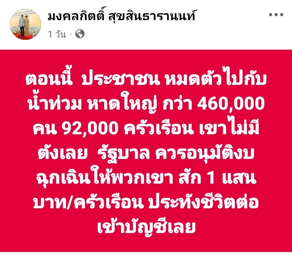 ตอนนี้ ประชาชน หมดตัวไปกับน้ำท่วม หาดใหญ่ กว่า 460,000 คน 92,000 ครัวเรือน เขาไม่มีตังเลย รัฐบาล ควรอนุมัติงบฉุกเฉินให้พวกเขา สัก 1 แสนบาท/ครัวเรือน ประทังชีวิตต่อ เข้าบัญชีเลย
