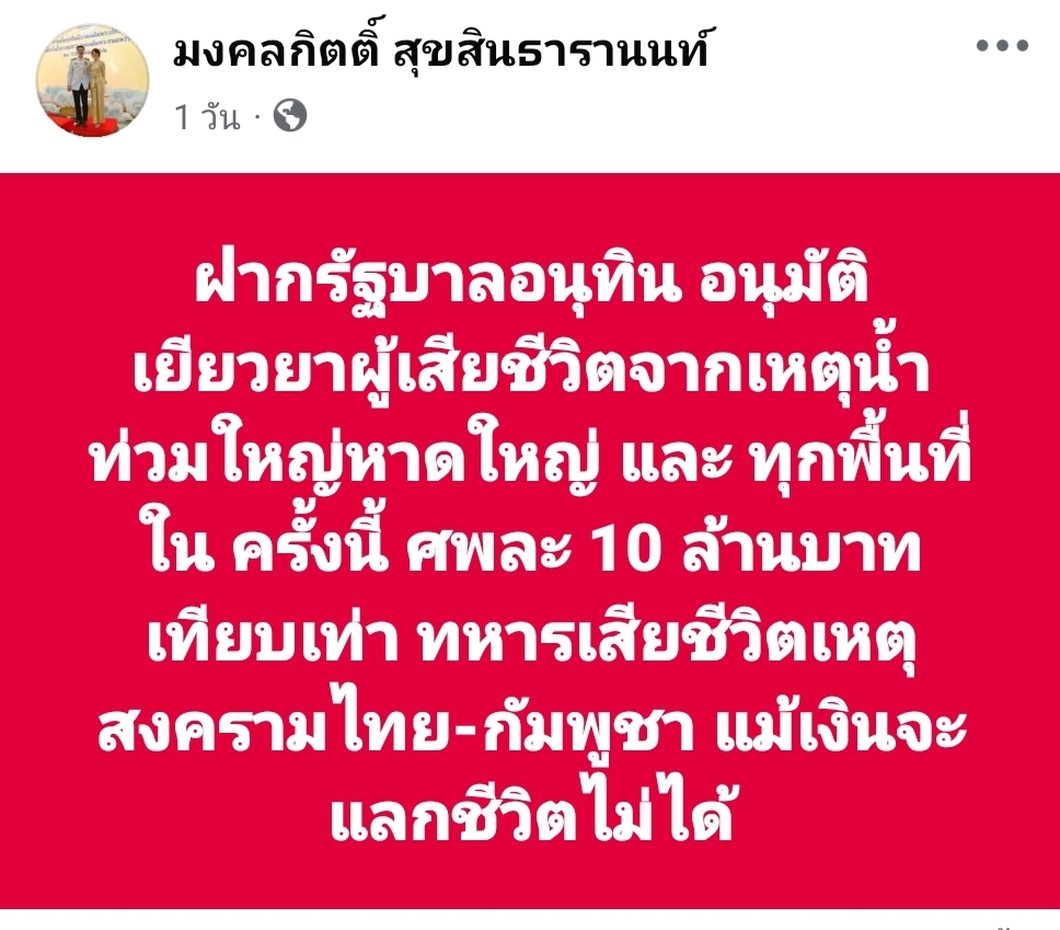 ฝากรัฐบาลอนุทิน อนุมัติ เยียวยาผู้เสียชีวิตจากเหตุน้ำท่วมใหญ่หาดใหญ่ และ ทุกพื้นที่ ใน ครั้งนี้ ศพละ 10 ล้านบาท เทียบเท่า ทหารเสียชีวิตเหตุสงครามไทย-กัมพูชา แม้เงินจะแลกชีวิตไม่ได้