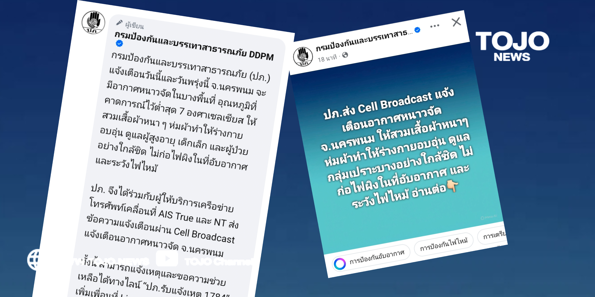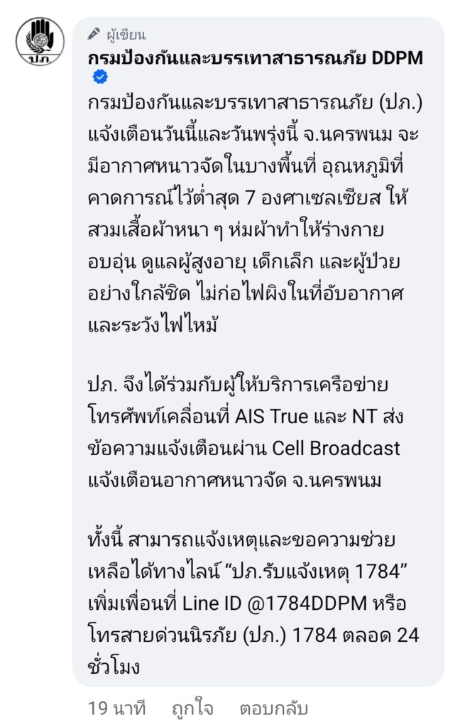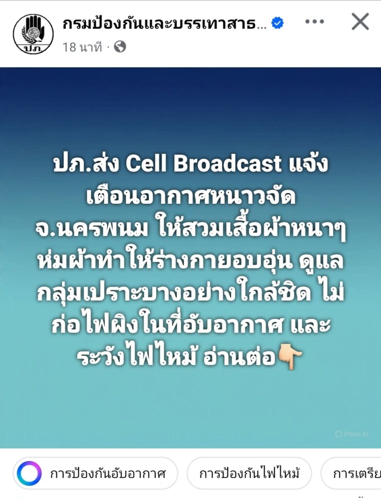ปภ. จึงได้ร่วมกับผู้ให้บริการเครือข่ายโทรศัพท์เคลื่อนที่ AIS True และ NT ส่งข้อความแจ้งเตือนผ่าน Cell Broadcast แจ้งเตือนอากาศหนาวจัด จ.นครพนม