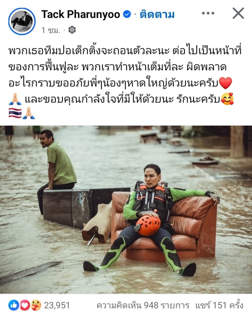 ผู้สื่อข่าวโตโจ้นิวส์รายงานว่า แทค ภรัณยู โรจนวุฒิธรรม นักแสดงชื่อดัง ในฐานะอาสาสมัครมูลนิธิปอเต็กตึ้ง โพสต์ขณะลงพื้นที่ช่วยประชาชนที่ประสพภัยน้ำท่วม หาดใหญ่ เมื่อวันที่ 28 พ.ย.68 โดยระบุว่า…