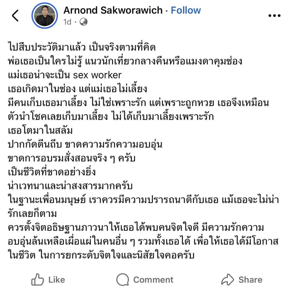 สิ่งที่เราคิดคือทำไมกลุ่มคนที่เรียกตัวเองว่ากลุ่มคนรักสถานบัน ถึงได้กล้าพฤติกรรมที่น่ารังเกียจทุกรูปแบบกับคนอื่นโดยอ้างความจงรักภักดี คุณจะไม่ชอบนักการเมืองคนไหน การวิพากษ์วิจารณ์ด่าทอทำได้เต็มที่กับบุคคลนั้นๆ แต่ถึงขึ้นกล่าวหาพ่อแม่คนอื่นด้วยถ้อยคำเหยียดหยามลดทอนคุณค่าแบบนี้ ตัวดิฉันเองที่เติบโตมาในสังคมที่แย่มากๆไม่ได้รับการอบรมสั่งสอน อย่างที่ผู้โพสต์กล่าวหายังไม่คิดทำอะไรแบบนี้กับพ่อแม่ใครเลย ดิฉันสนับสนุนหลักการ เรื่อง free speech เสมอมา แต่อันนี้มันเข้าข่ายเป็น hate speech ทำไมคนที่แอบอ้างตัวเองว่ารักสถานบันกว่าใครและต้องการปกป้องสถานบัน ถึงเลือกใช้วิธีลดทอนคุณค่าความเป็นมนุษย์ของคนที่เห็นต่าง แทนที่จะถกเถียงกันด้วยวิธีอย่างคนที่ได้รับการอบรมมาบ้างแล้วใช่กัน เถียงด้วยเห็นผลหักล้างกันด้วยตรรกะ