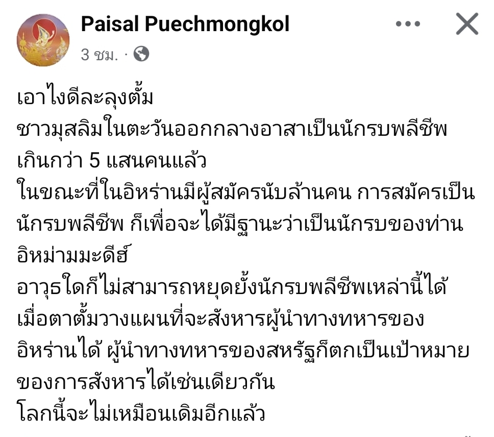 ผู้สื่อข่าวโตโจ้นิวส์รายงานว่า นายไพศาล พืชมงคล อดีตที่ปรึกษารัฐมนตรีว่าการกระทรวงกลาโหม โพสต์ระบุว่า…