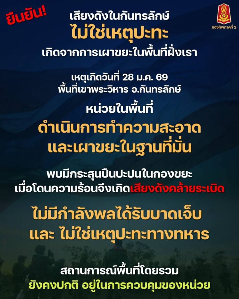 ทภ.2 ยืนยัน ไม่ใช่เสียงปะทะ ชายแดน อ.กันทรลักษ์