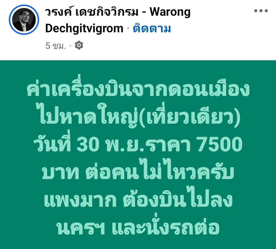 หมอวรงค์ เจอ ค่าตั๋วโหดเครื่องบินไป หาดใหญ่ 7,500 บาท ต่อคน