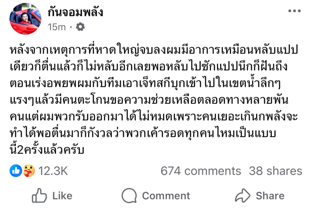 หลังจากเหตุการที่หาดใหญ่จบลงผมมีอาการเหมือนหลับแปปเดียวก็ตื่นแล้วก็ไม่หลับอีกเลยพอหลับไปซักแปปนึกก็ฝันถึงตอนเร่งอพยพผมกับทีมเอาเจ็ทสกีบุกเข้าไปในเขตน้ำลึกๆแรงๆแล้วมีคนตะโกนขอความช่วยเหลือตลอดทางหลายพันคนแต่ผมพวกรับออกมาได้ไม่หมดเพราะคนเยอะเกินกพลังจะทำได้พอตื่นมาก็กังวลว่าพวกเค้ารอดทุกคนไหมเป็นแบบนี้2ครั้งแล้วครับ