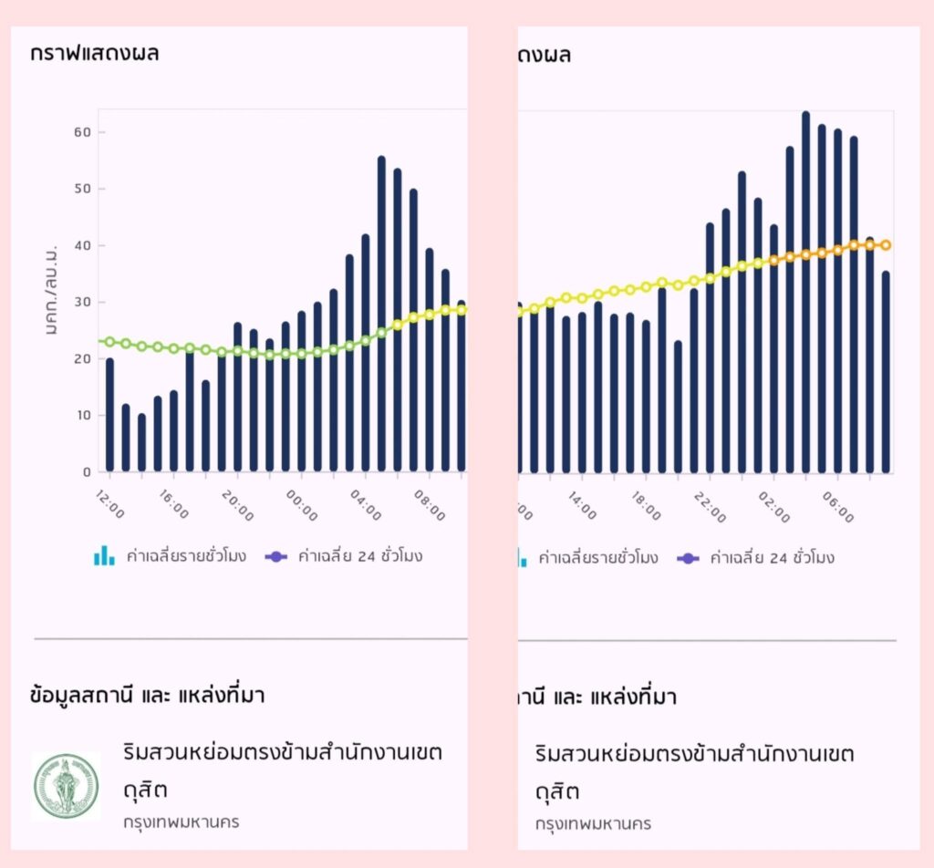 โดยทั่วไปแล้ว ช่วง ใกล้รุ่งเช้า คือช่วงที่มีฝุ่นมากที่สุด ขณะที่ช่วง กลางวัน เป็นช่วงที่มีฝุ่นน้อย (ดูกราฟประกอบได้ครับ เป็นผลการตรวจวัดอย่างเป็นทางการ จากแอพ Air4Thai)