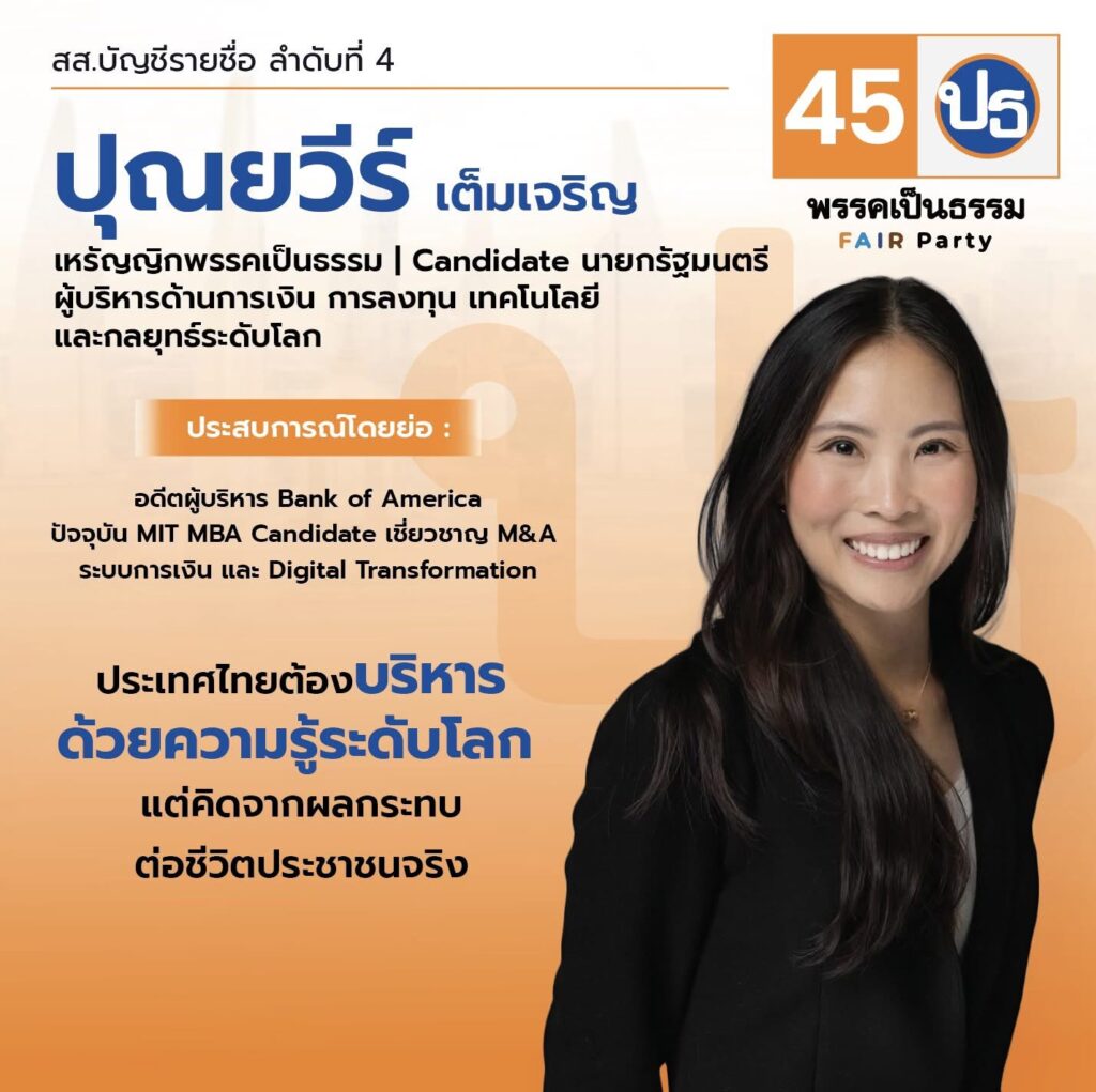 จึงอาสาเข้ามาร่วมทำงานกับพรรคเป็นธรรม พร้อมด้วยประสบการณ์และเครือข่ายชั้นนำ ทั้งจากบริษัทการเงินระดับโลก และสถาบันการศึกษาระดับ Ivy League จากสหรัฐอเมริกา