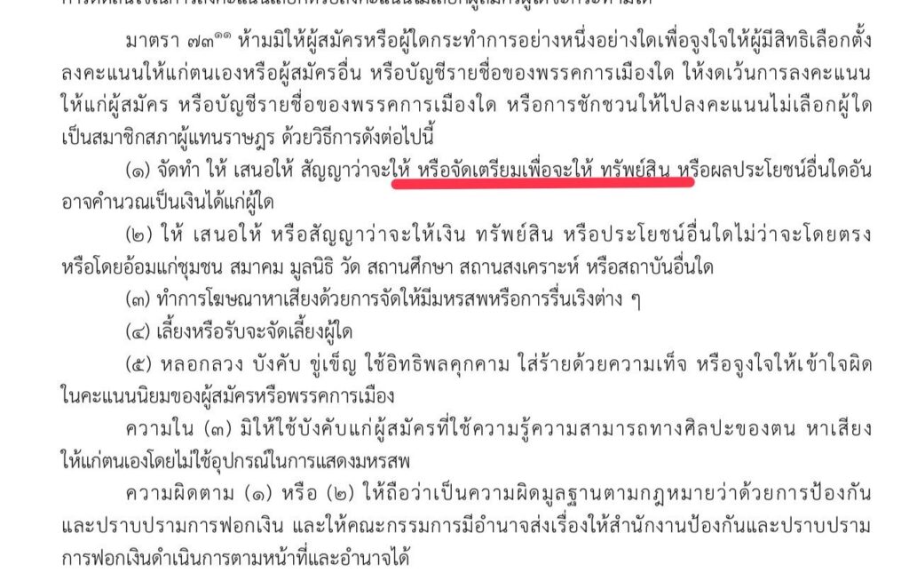 ตาม มาตรา 73 พรป.ว่าด้วยการเลือกตั้ง สส. พ.ศ. 2561 (และที่แก้ไขเพิ่มเติม) ซึ่งเป็นข้อหลักว่าด้วยการห้ามจูงใจหรือ ”ซื้อเสียง“ นั้น