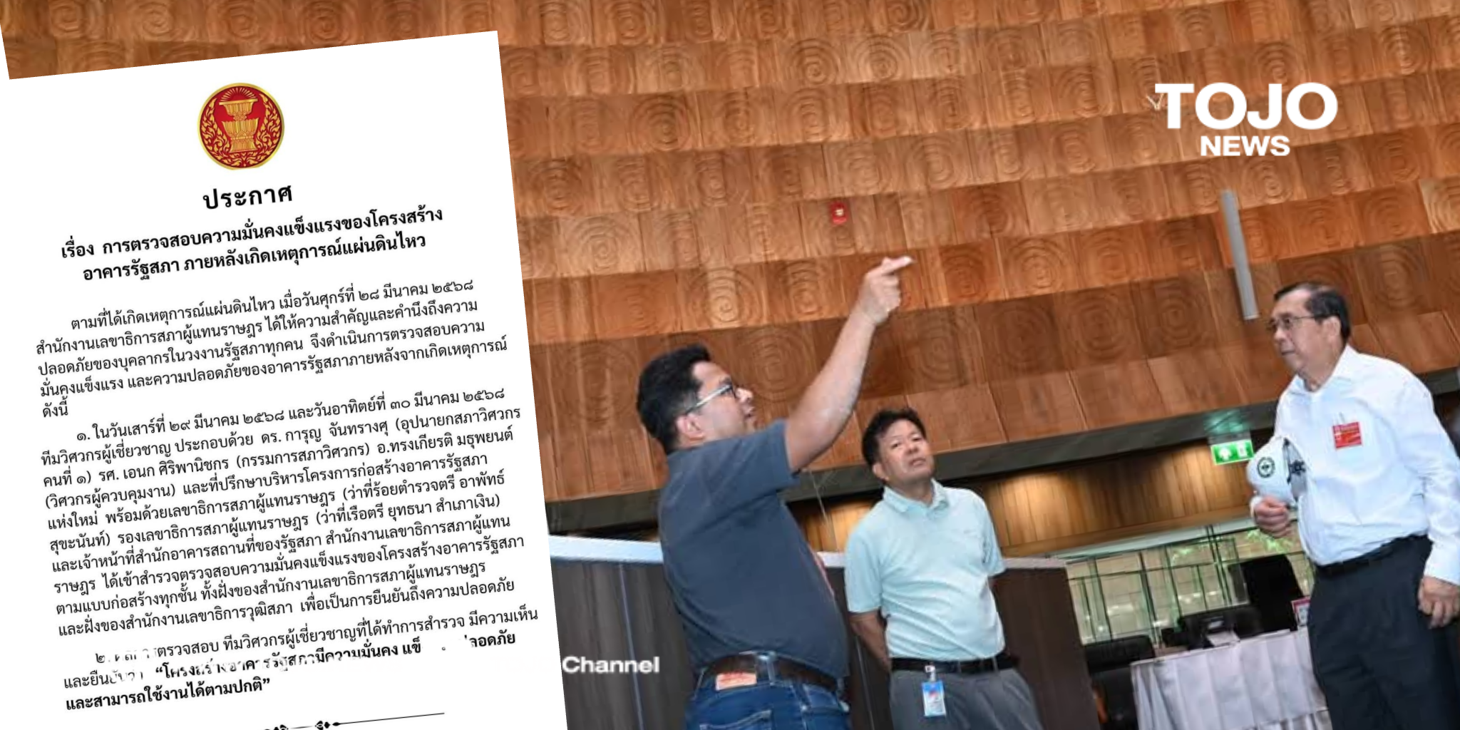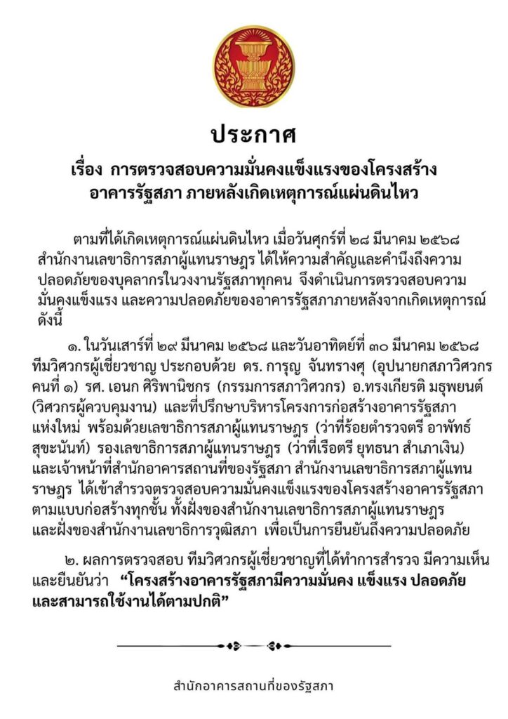 ภายหลังเหตุการณ์แผ่นดินไหวเมื่อวันศุกร์ที่ 28 มี.ค. ที่ผ่านมา โดยตรวจสอบตามแบบก่อสร้างทุกชั้น ทั้งฝั่งของสำนักงานเลขาธิการสภาผู้แทนราษฎรและฝั่งของสำนักงานเลขาธิการวุฒิสภา เพื่อเป็นการยืนยันถึงความปลอดภัย
