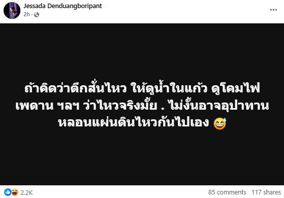ถ้าคิดว่าตึกสั่นไหว ให้ดูน้ำในแก้ว ดูโคมไฟเพดาน ฯลฯ ว่าไหวจริงมั้ย . ไม่งั้นอาจอุปาทาน หลอนแผ่นดินไหวกันไปเอง