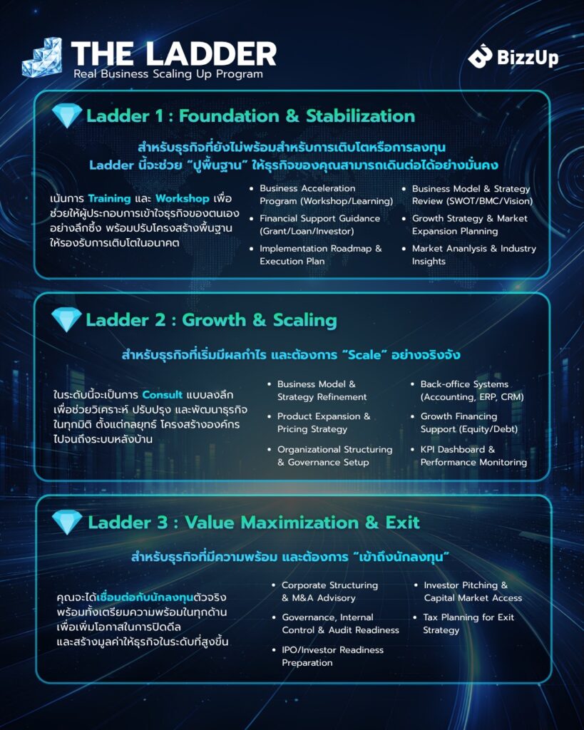 Ladder 2: Growth & Scale ขยายธุรกิจและเพิ่มประสิทธิภาพ Ladder 3: Value Maximization & Exit