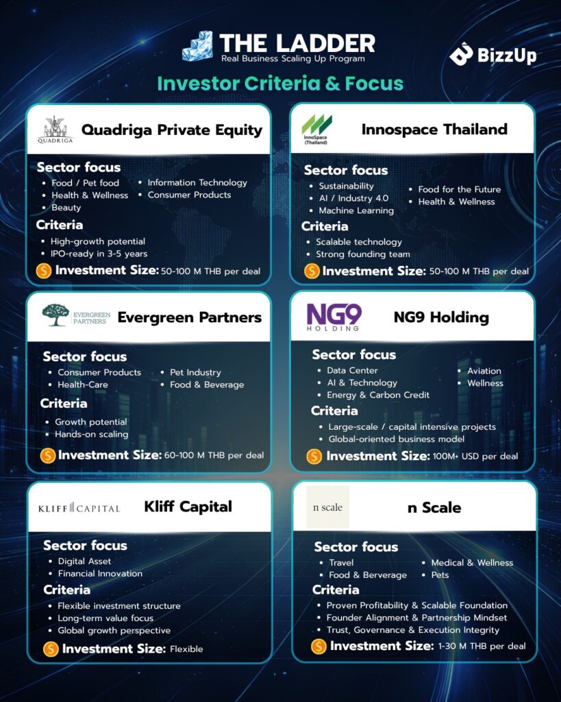 นักลงทุนเหล่านี้จะบอกคุณสมบัติของธุรกิจที่ตัวเองต้องการที่จะลงทุน และให้ผู ้ประกอบการที่เข้าเกณฑ์ เหล่านั้น ได้พบกันนักลงทุน โดยแบ่งเป็น 3 Ladder ได้แก่ Ladder 1: Foundation สร้างพื้นฐานธุรกิจ