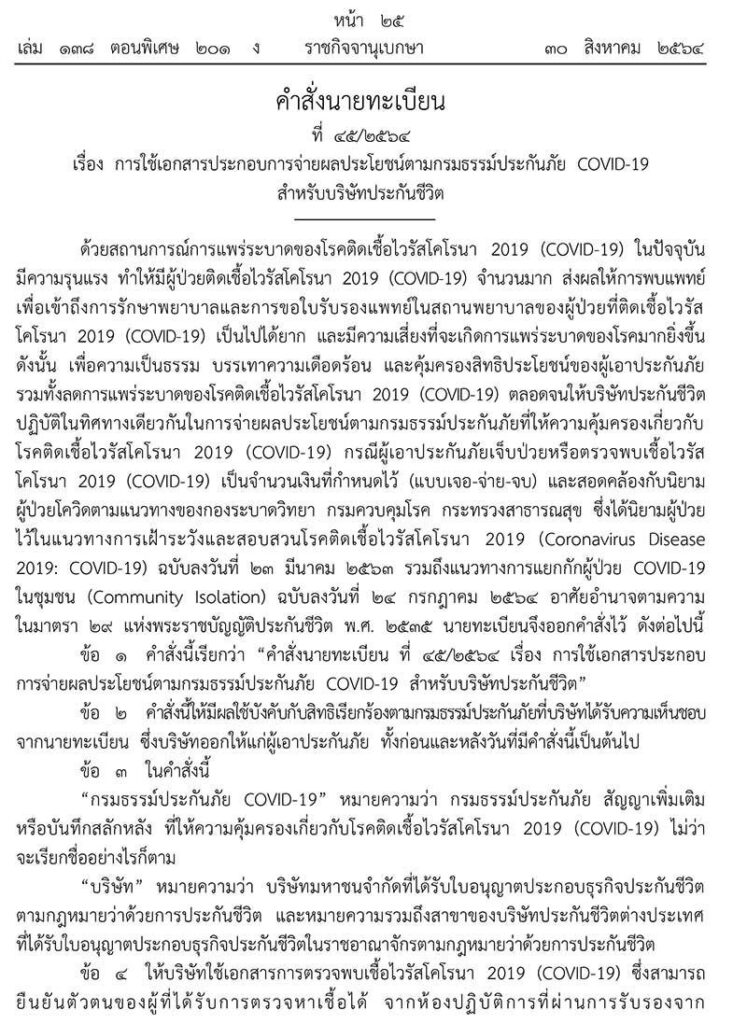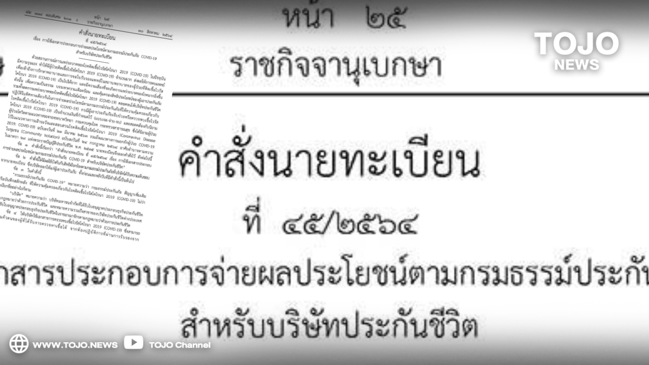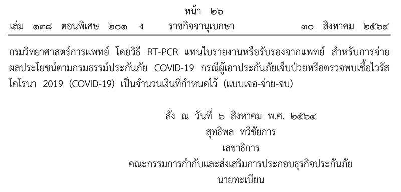ผู้สื่อข่าวโตโจ้นิวส์รายงานว่า วันที่ 31 ส.ค.64 เว็บไซต์ ราชกิจจานุเบกษาได้ เผยแพร่ คำสั่งนายทะเบียน ที่ 45/2564 เรื่อง การใช้เอกสารประกอบการจ่ายผลประโยชน์ตามกรมธรรม์ประกันภัย โควิด-19 (COVID-19) สำหรับบริษัทประกันชีวิต กรณีผู้เอาประกันภัยเจ็บป่วยหรือตรวจพบเชื้อไวรัสโคโรนา 2019 (COVID-19) เป็นจำนวนเงินที่กำหนดไว้ (แบบเจอ-จ่าย-จบ)