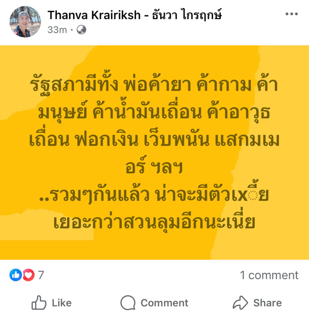 รัฐสภามีทั้ง พ่อค้ายา ค้ากาม ค้ามนุษย์ ค้าน้ำมันเถื่อน ค้าอาวุธเถื่อน ฟอกเงิน เว็บพนัน แสกมเมอร์ ฯลฯ