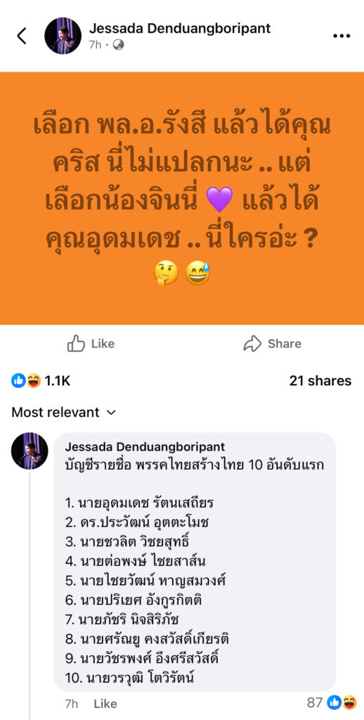 อ.เจษฎา กาง! ผู้สมัครบัญชีรายชื่อไทยรักไทย ถ้าเลือกน้องจินนี่ ได้อุดมเดช