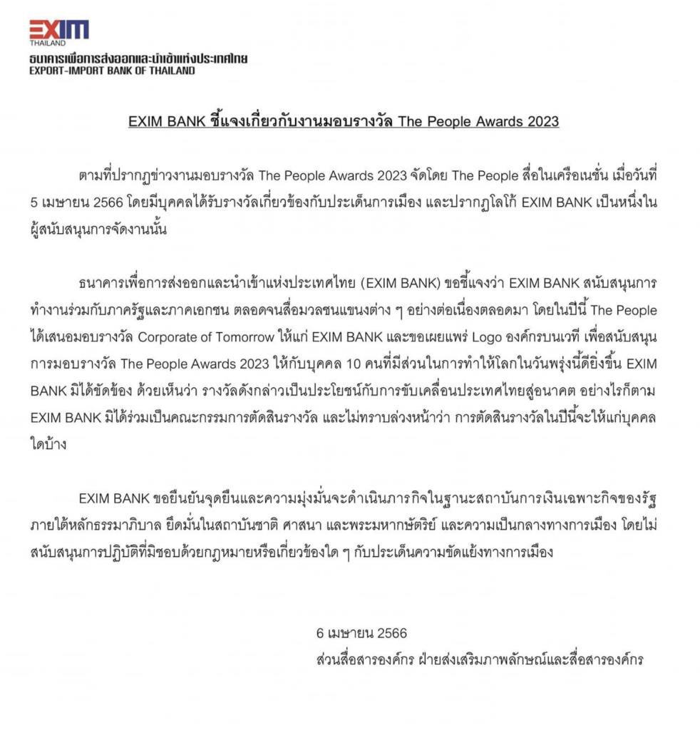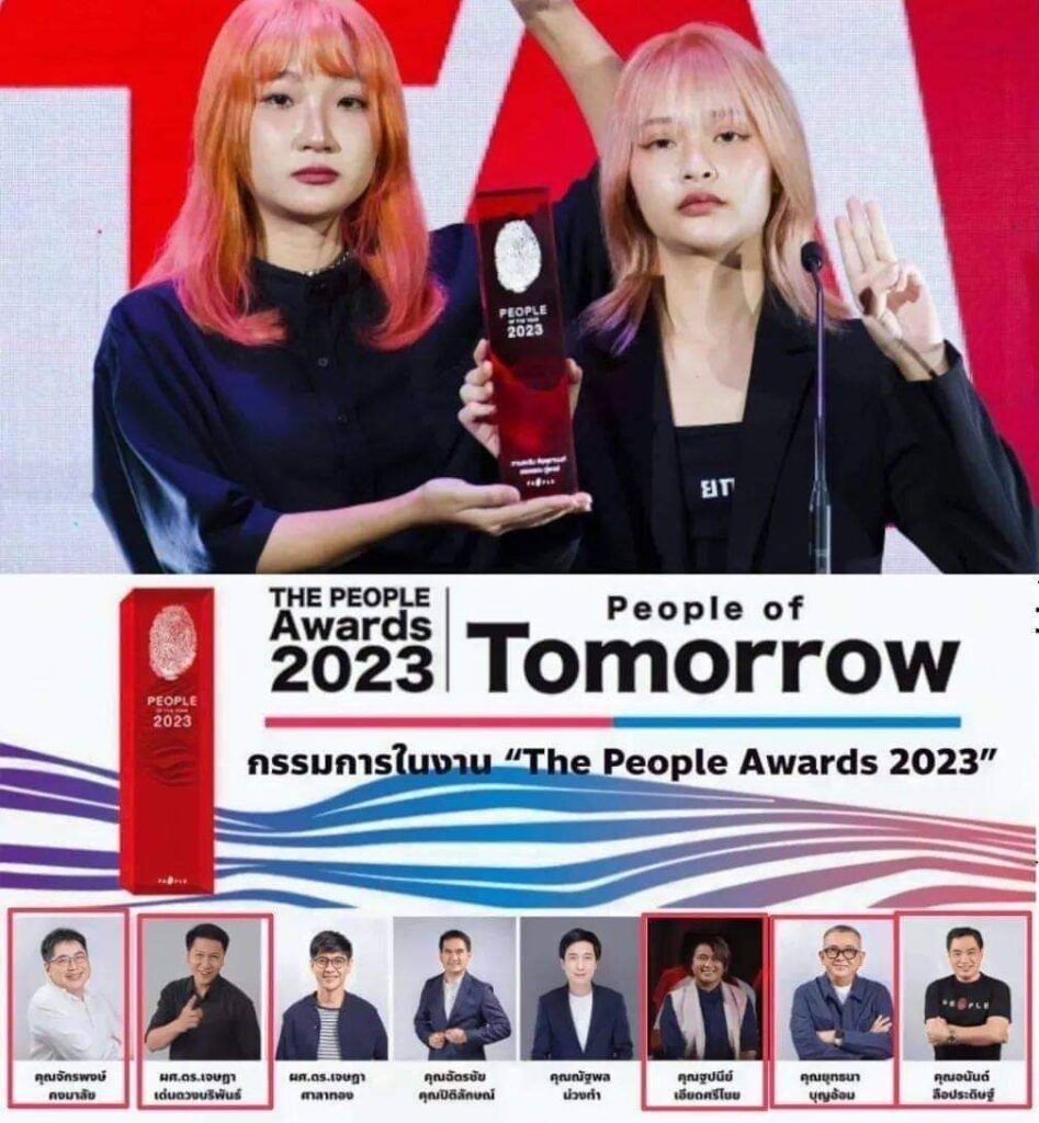เมื่อช่วงสายของวันที่ 7 เม.ย.2566 มีความคืบหน้าจากกรณีการมอบรางวัล The People Awards 2023 ซึ่งมอบรางวัลให้กับ 10 คนต้นแบบ ผู้พร้อมสำหรับอนาคตที่จะมาถึง ภายใต้คอนเซปต์ ‘People of Tomorrow’โดยมีชื่อของ น.ส.ทานตะวัน ตัวตุลานนท์ หรือ ตะวัน และ น.ส.อรวรรณ ภู่พงษ์ หรือ แบม สองแนวร่วมม็อบ 3 นิ้ว ผู้ต้องหาคดี มาตรา 112 รวมอยู่ด้วย